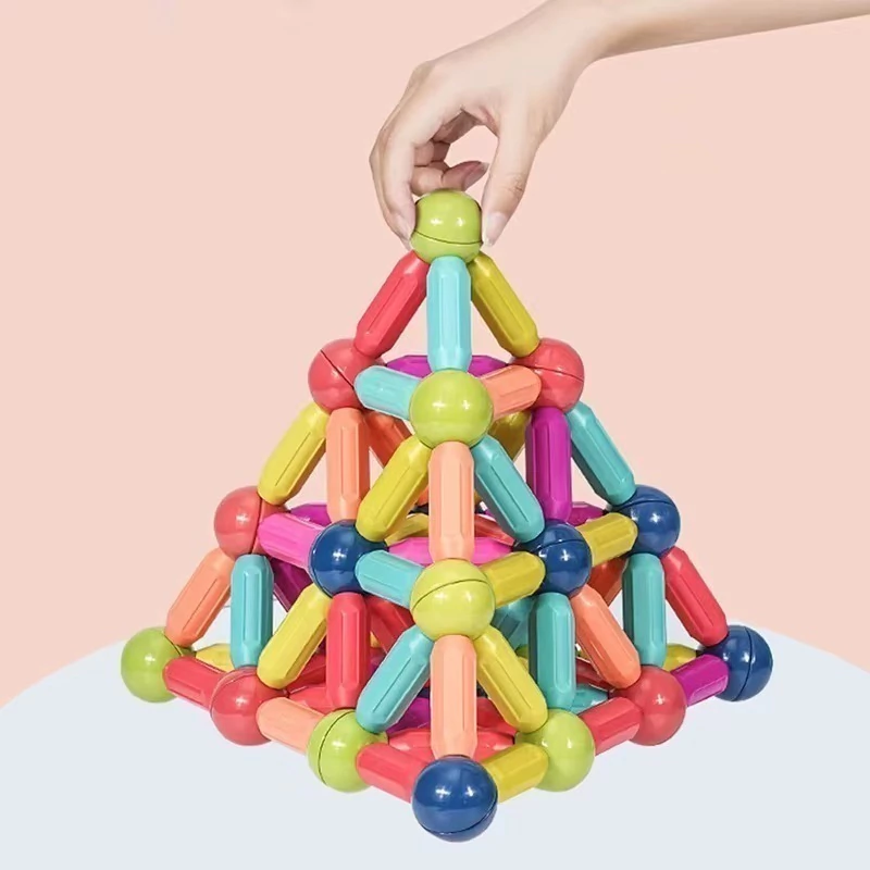 Este set incluye barras magnéticas y esferas de conexión que permiten crear desde figuras simples hasta estructuras complejas.